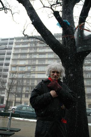 ...Il s'appelle Serge Bloch. Depuis deux jours, il passe son temps dans un arbre, perché à 3 mètres, juste devant la cité des Fleurs, boulevard Arago. Il est équipé pour tenir un siège. Il a tiré le téléphone et l'électricité. Mais il fait froid et de temps en temps, il va se réchauffer dans sa voiture... Faudrait pas prendre froid, le Centenaire pourrait le payer.