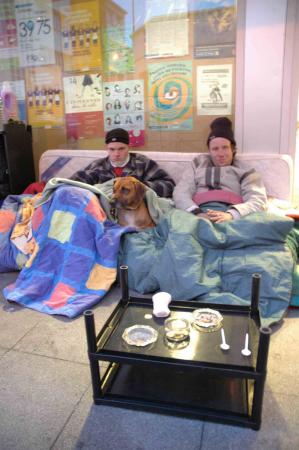 Il y a là Geoffroy, Jean-Marie et leur chien, Tony. Les passants qui entrent dans la bibliothèque dévorer un livre leur jettent un regard, tantôt apeuré, le plus souvent furtif.