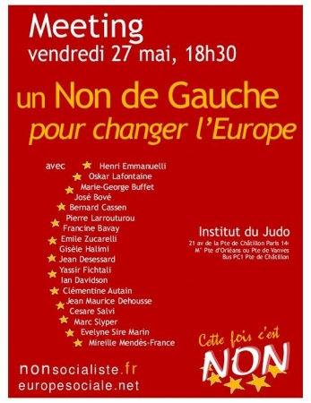 Ce soir, mardi 24 mai à 20h au FIAP Jean Monet, 30 rue Cabanis dans le 14e (voir le plan d'accès), il y a un grand meeting pour le OUI Socialiste avec de sacré têtes d'affiche :