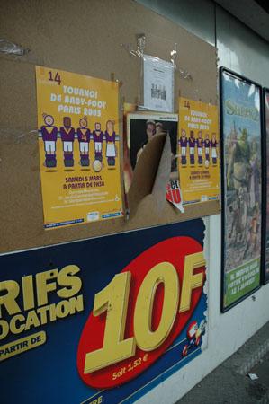 Un exemple ? Oui, avec ce superbe affichage sauvage municipal (un bien joli concept), avenue du Général Leclerc sur un distributeur de vidéos abandonné... Enfin, c'est pour la bonne cause puisque c'est pour annoncer le "Tournoi de baby-foot" que notre Mairie d'arrondissement organise après-demain, samedi 5 mars.