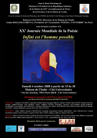 Placée sous le Haut Patronage de M. le Président de la République Italienne , de la Mairie du XIVe Arrondissement de Paris, de la Ville de Venise, organisée par Mme. Giulia Bogliolo Bruna, Présidente de l’Association « Poesia-2 Ottobre » de Paris et M.  Roberto Giacone, Directeur de la Maison de l’Italie, se déroulera, le samedi 4 octobre 2008, à la Maison de l’Italie, à partir de 15 heures 30, la XXe Journée Mondiale de la Poésie , manifestation officielle de la Cité universitaire de Paris.